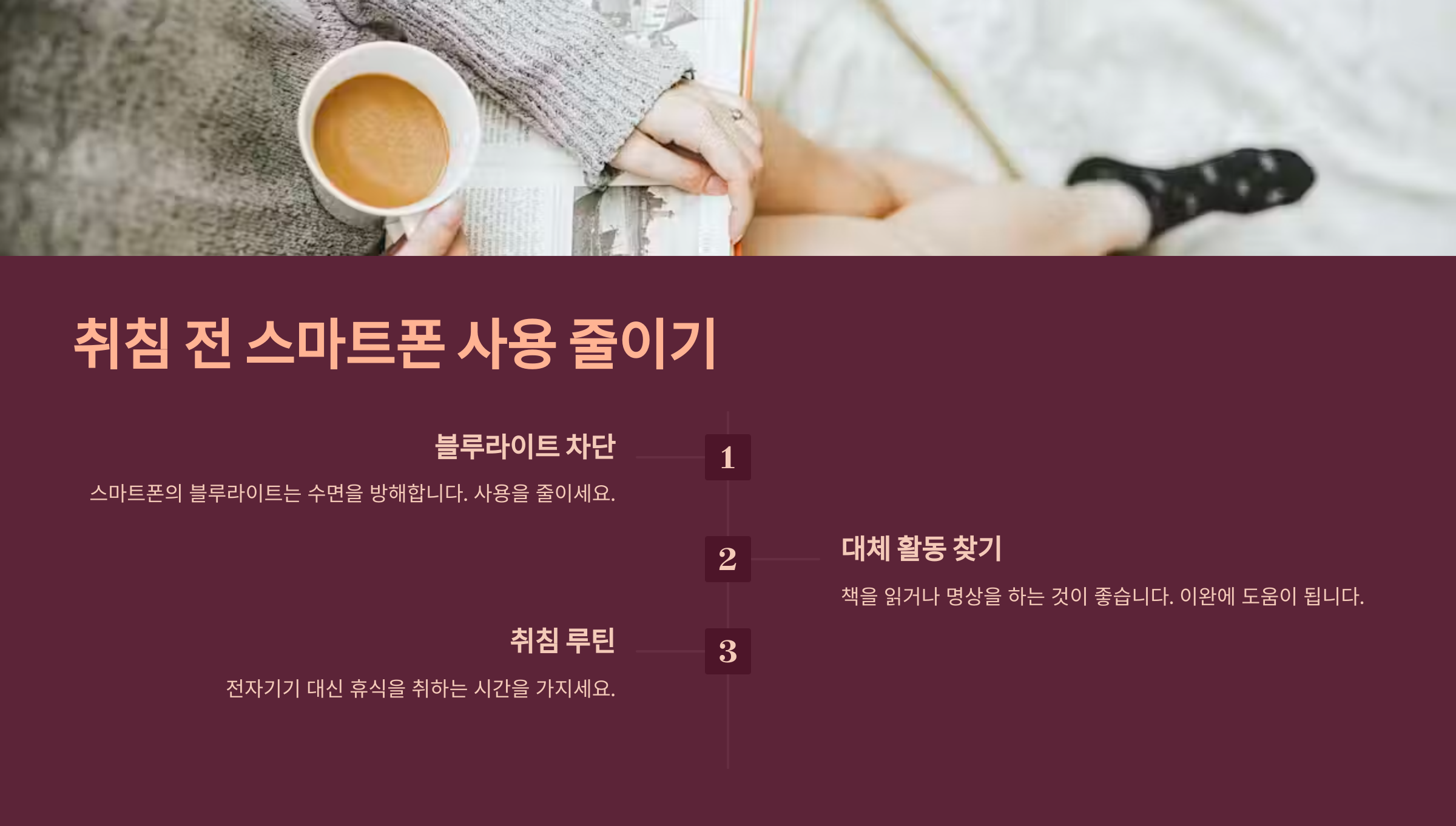 | 전자 기기 멀리하기 | 취침 1시간 전 스마트폰 사용 중단 |