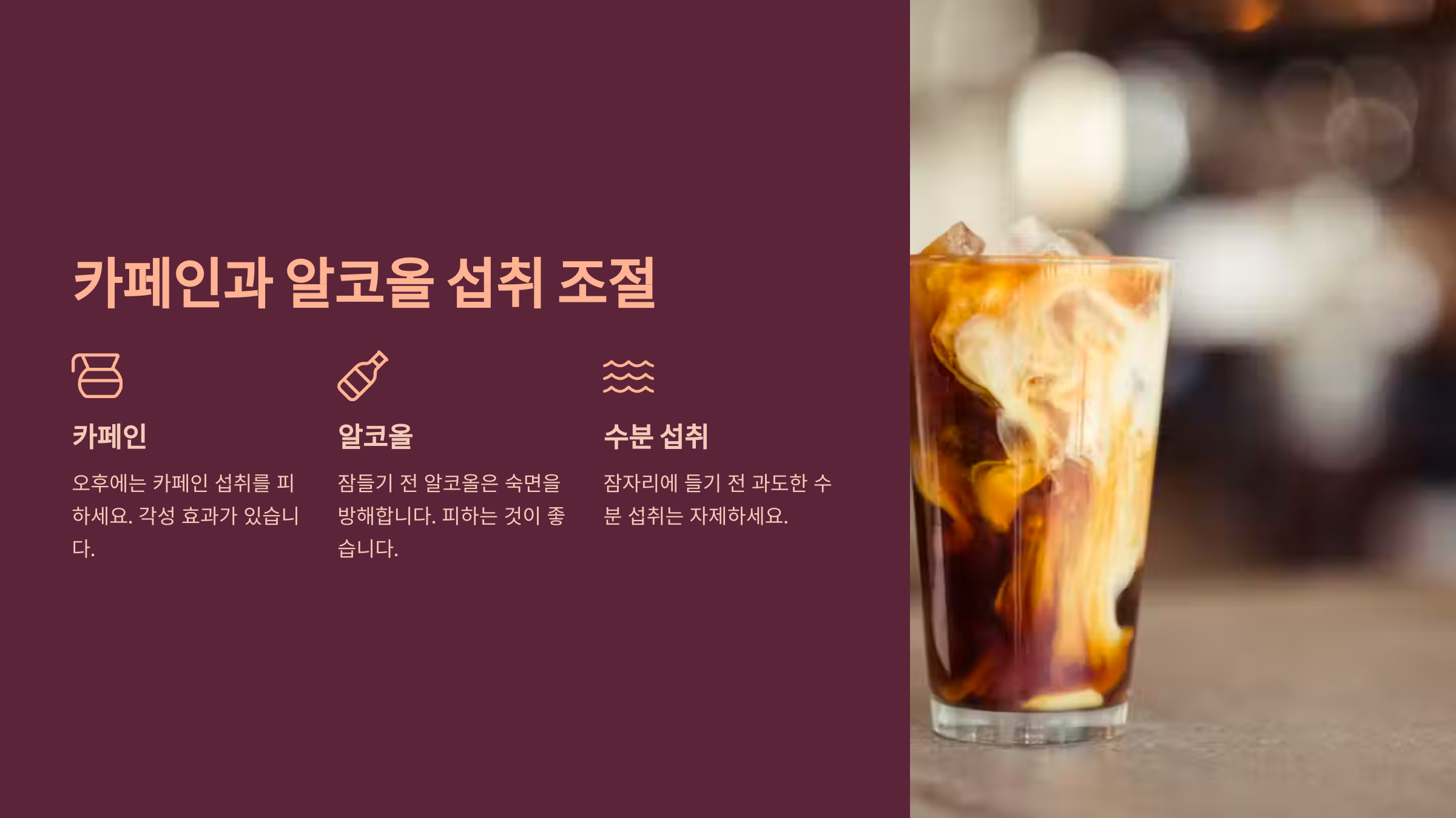 알코올도 마찬가지예요. 많은 사람들이 술을 마시면 잠이 잘 올 거라고 생각하지만, **알코올은 오히려 깊은 수면을 방해하고 새벽에 자주 깨게 만들어요**. 그래서 숙면을 원한다면 취침 전 음주는 피하는 것이 좋아요.
