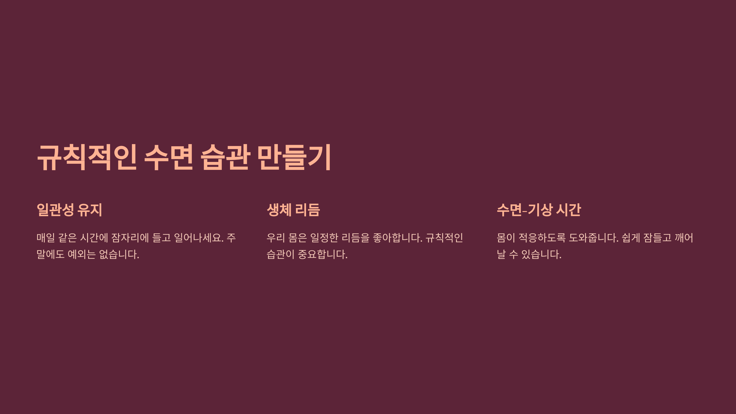 매일 **같은 시간**에 자고 일어나는 것이 중요해요. 주말에도 늦잠을 자지 않고 일정한 패턴을 유지하면 생체 리듬이 안정되면서 숙면을 취할 수 있어요.