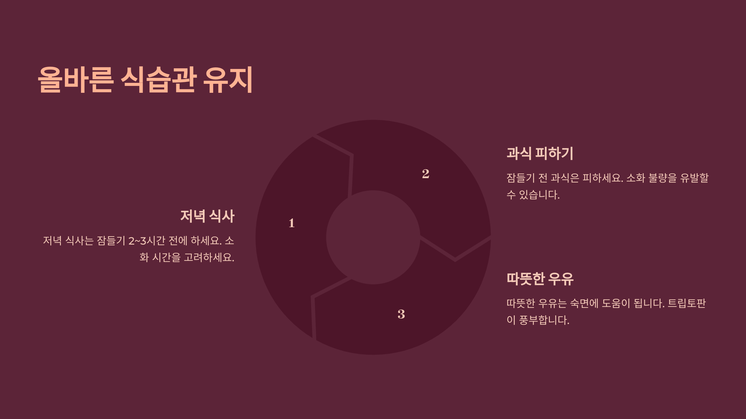**잠들기 2~3시간 전에는 가볍게 소화가 잘되는 음식을 섭취하는 것이 좋아요**. 특히 바나나, 견과류, 따뜻한 우유 같은 음식은 멜라토닌 분비를 촉진해 숙면에 도움이 돼요.