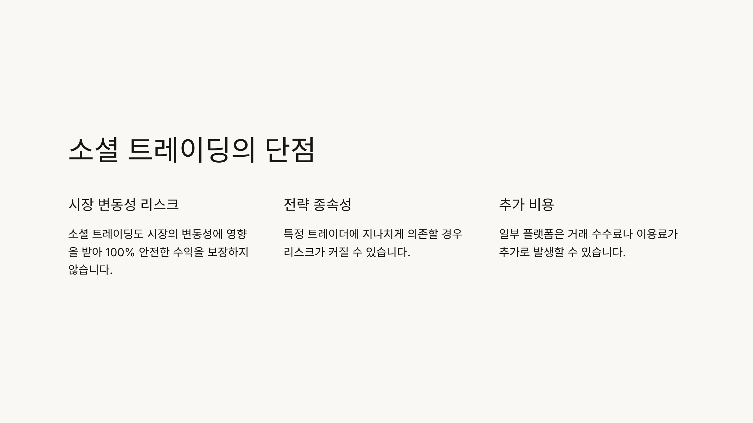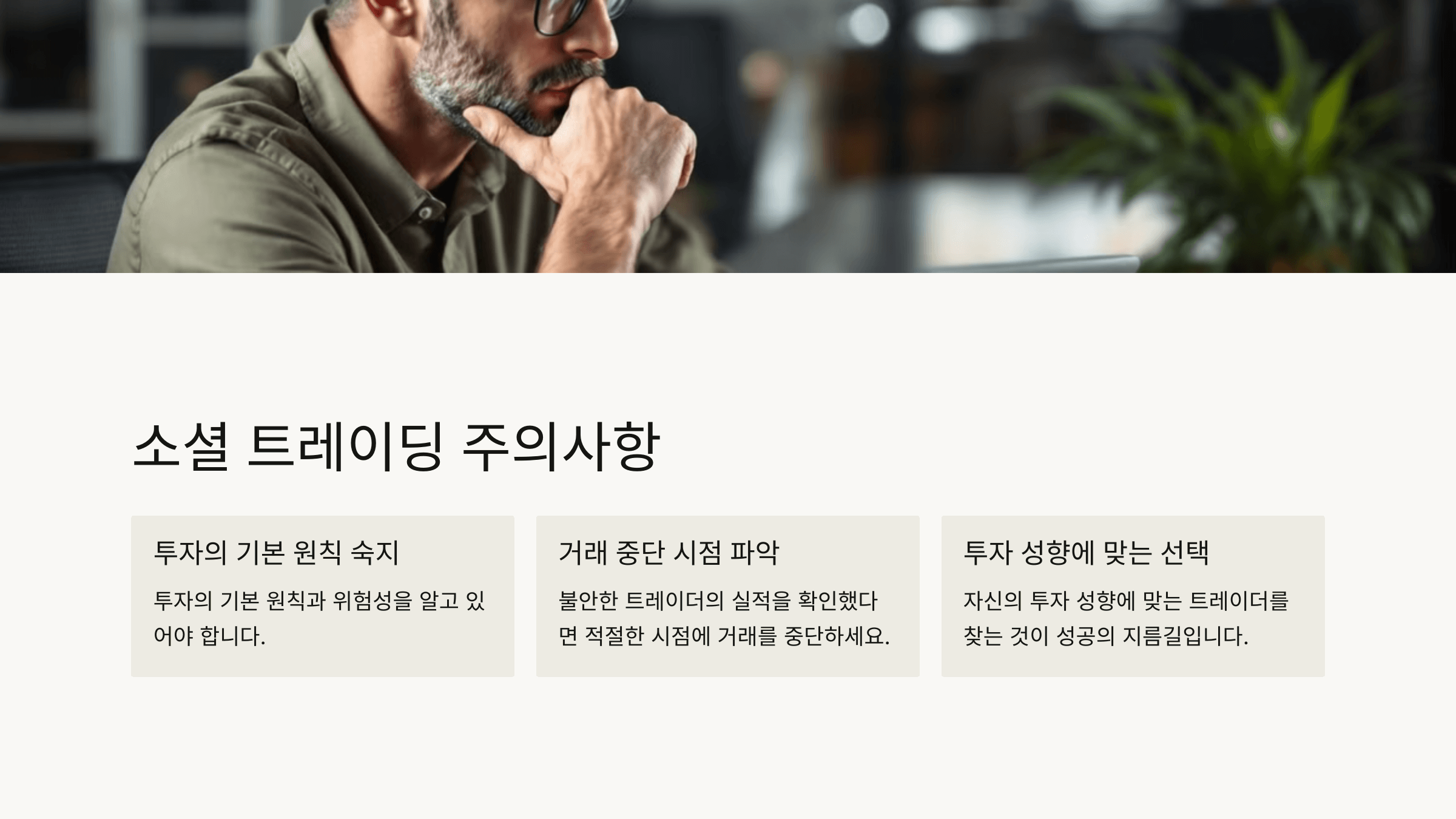 소셜 트레이딩이 아무리 간편하더라도 투자의 기본 원칙과 위험성을 알고 있어야 합니다. 무리한 투자는 피하고, 자신이 감당할 수 있는 범위에서 투자하세요.