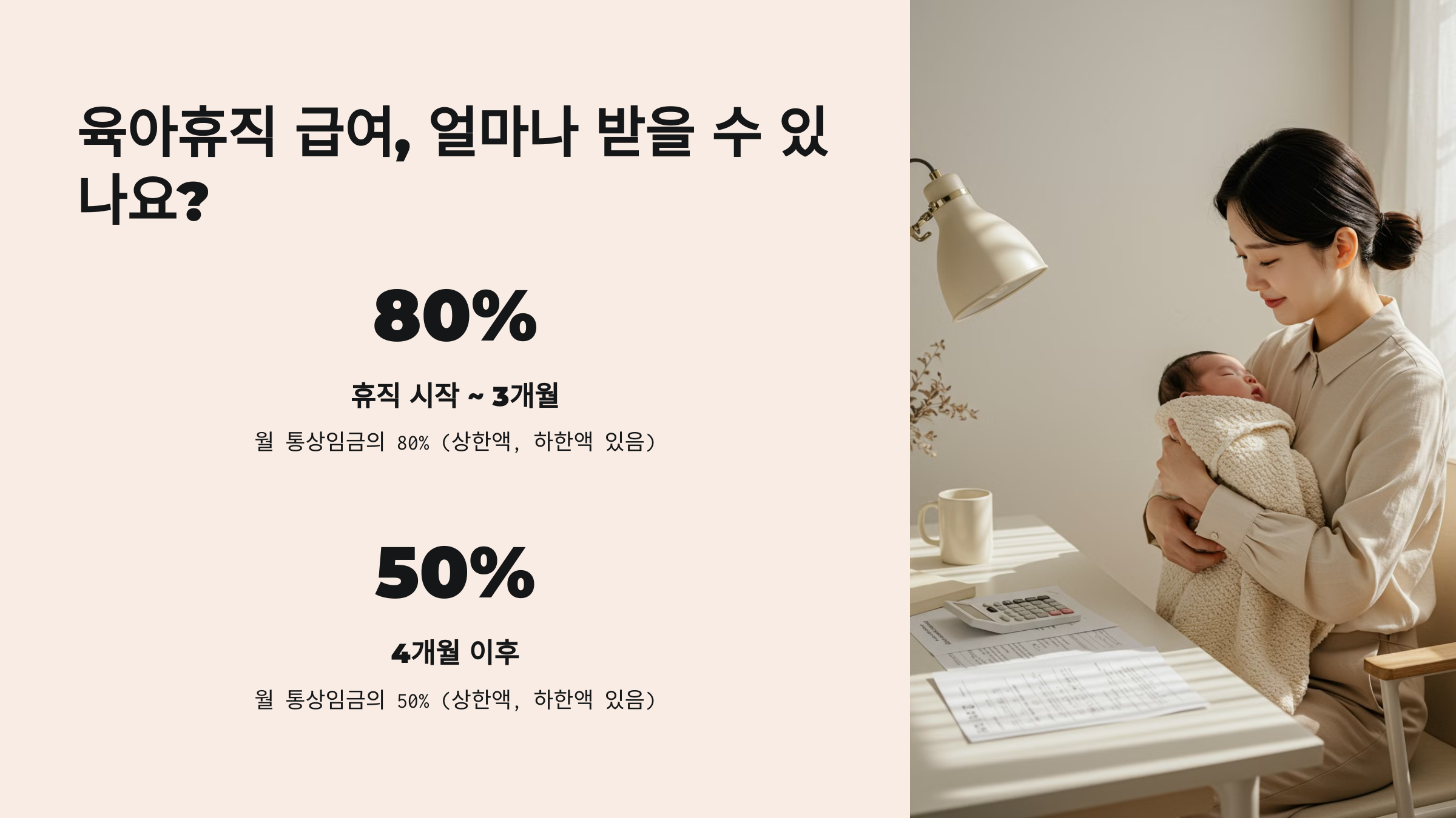 ✅ 지급 비율: 육아휴직 전 평균임금의 80% (단, 최대 150만 원, 최소 70만 원)