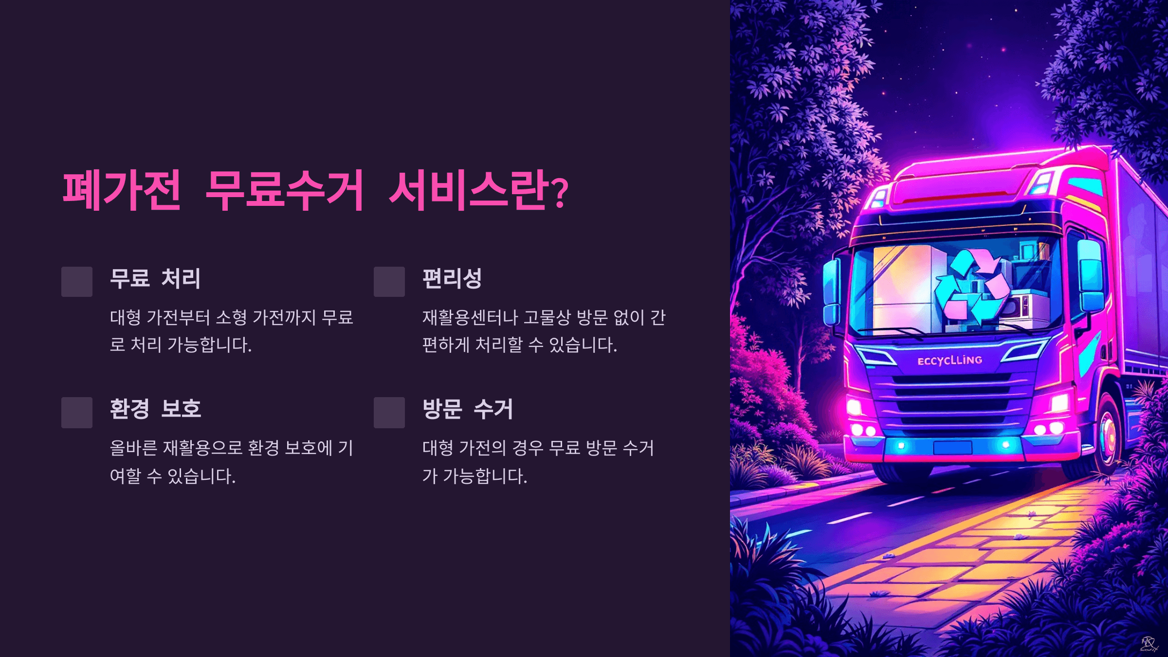 폐가전 무료수거 서비스는 환경부와 한국전자제품자원순환공제조합에서 운영하는 시스템으로, 가정에서 발생하는 폐가전을 무료로 수거해주는 서비스입니다. 💡