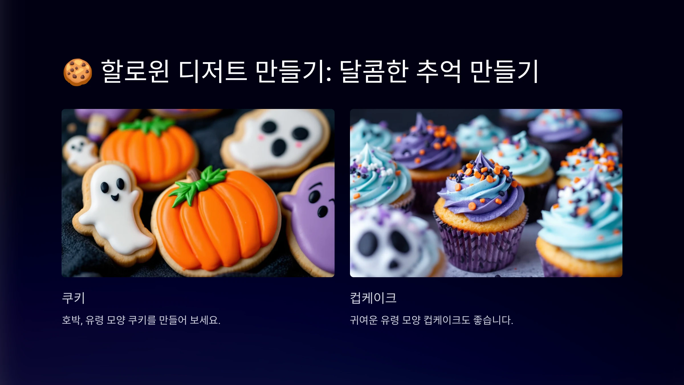 호박 모양의 쿠키나 귀여운 유령 모양의 컵케이크를 만들어보세요. 이색적인 할로윈 테마 디저트는 어린이들에게도, 어른들에게도 인기 만점입니다. 또한 직접 만든 디저트를 나누며 이웃과 더 친해지는 기회가 될 수도 있습니다.
