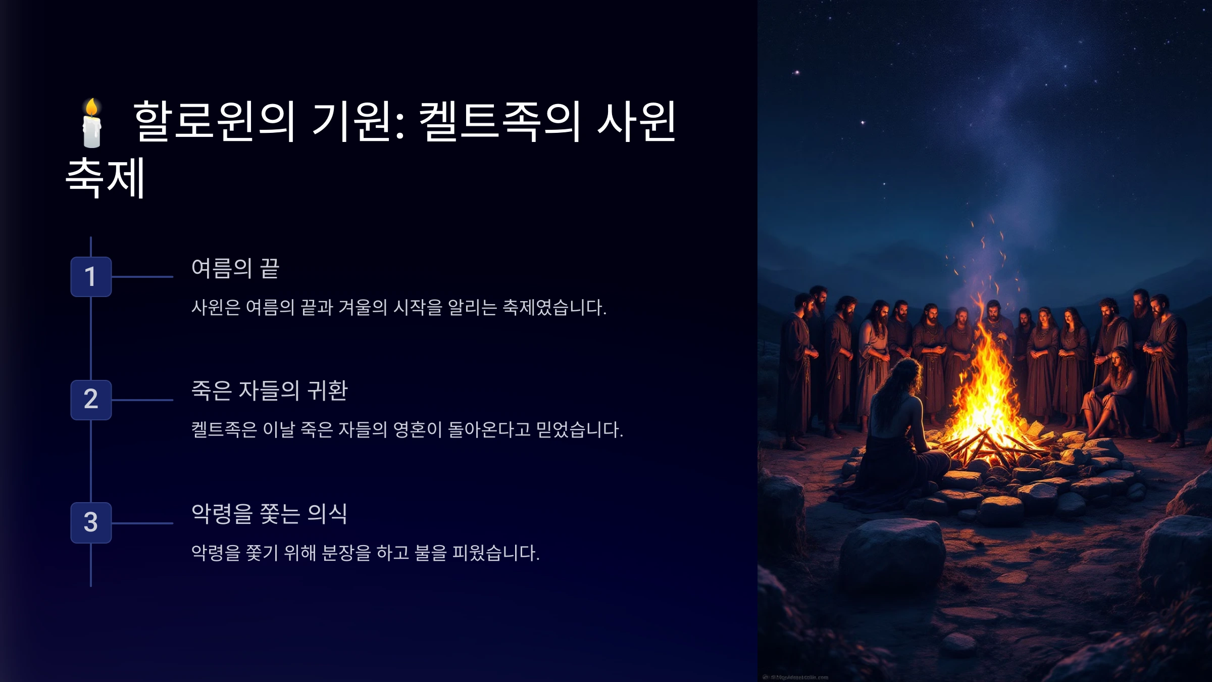 할로윈은 고대 켈트족의 축제인 '사윈(Samhain)'에서 유래되었습니다. 이 축제는 여름이 끝나고 어두운 겨울이 시작되는 시점에 열리며, 사람들은 이 날이 죽은 자들의 영혼이 다시 살아나는 날이라고 믿었습니다. 🎃 이를 두려워한 사람들은 유령을 쫓기 위해 불을 밝히고, 나쁜 영혼으로부터 자신을 보호하기 위해 기괴한 분장을 하기도 했습니다.