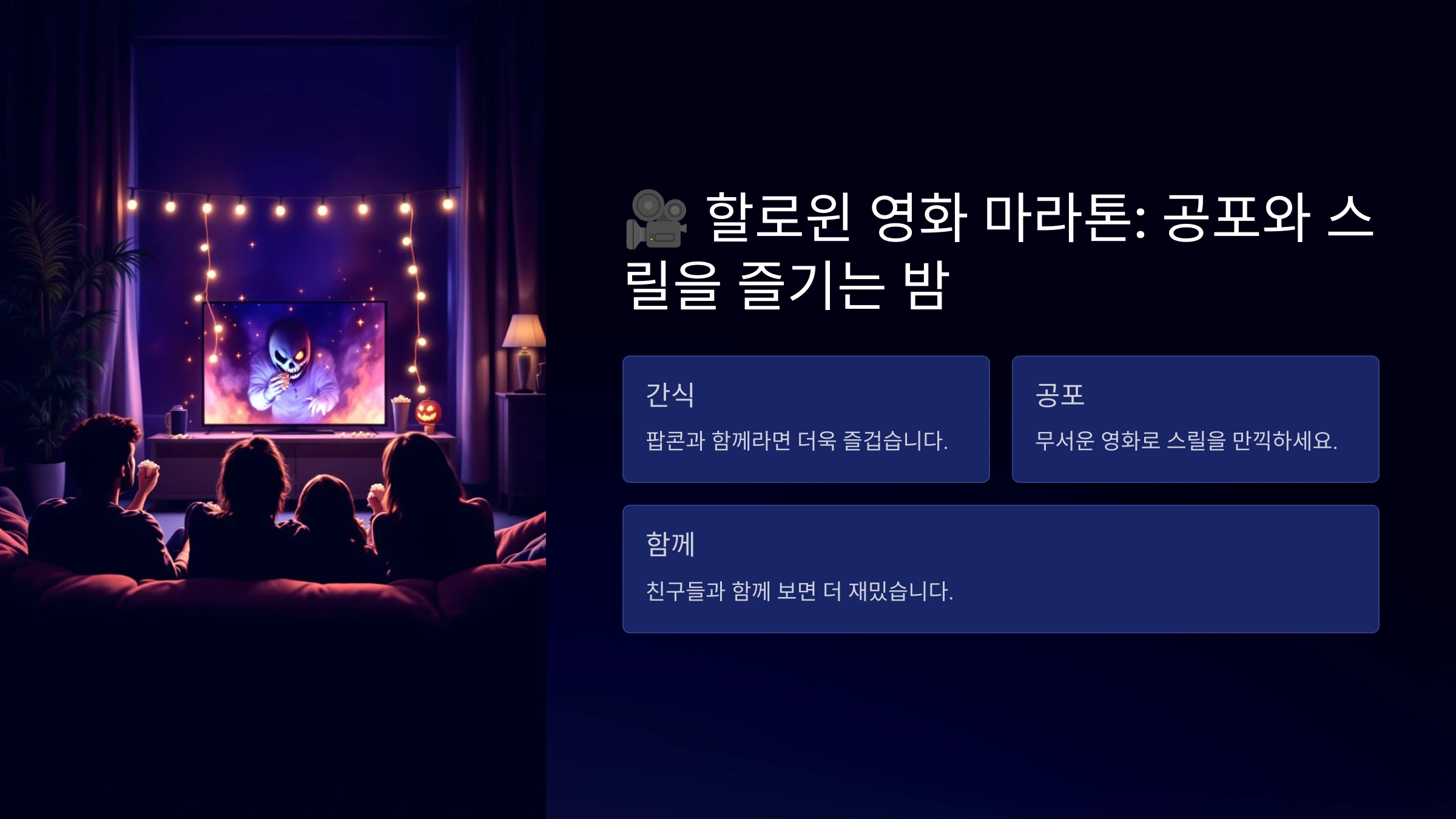 무서운 영화를 좋아하는 사람들에게는 할로윈만큼 완벽한 날이 없죠. 고전 공포 영화부터 최신 스릴러까지, 할로윈을 맞이해 공포 영화 마라톤을 즐겨보세요. 가족과 함께라면 어린이용 할로윈 영화도 좋은 선택입니다.