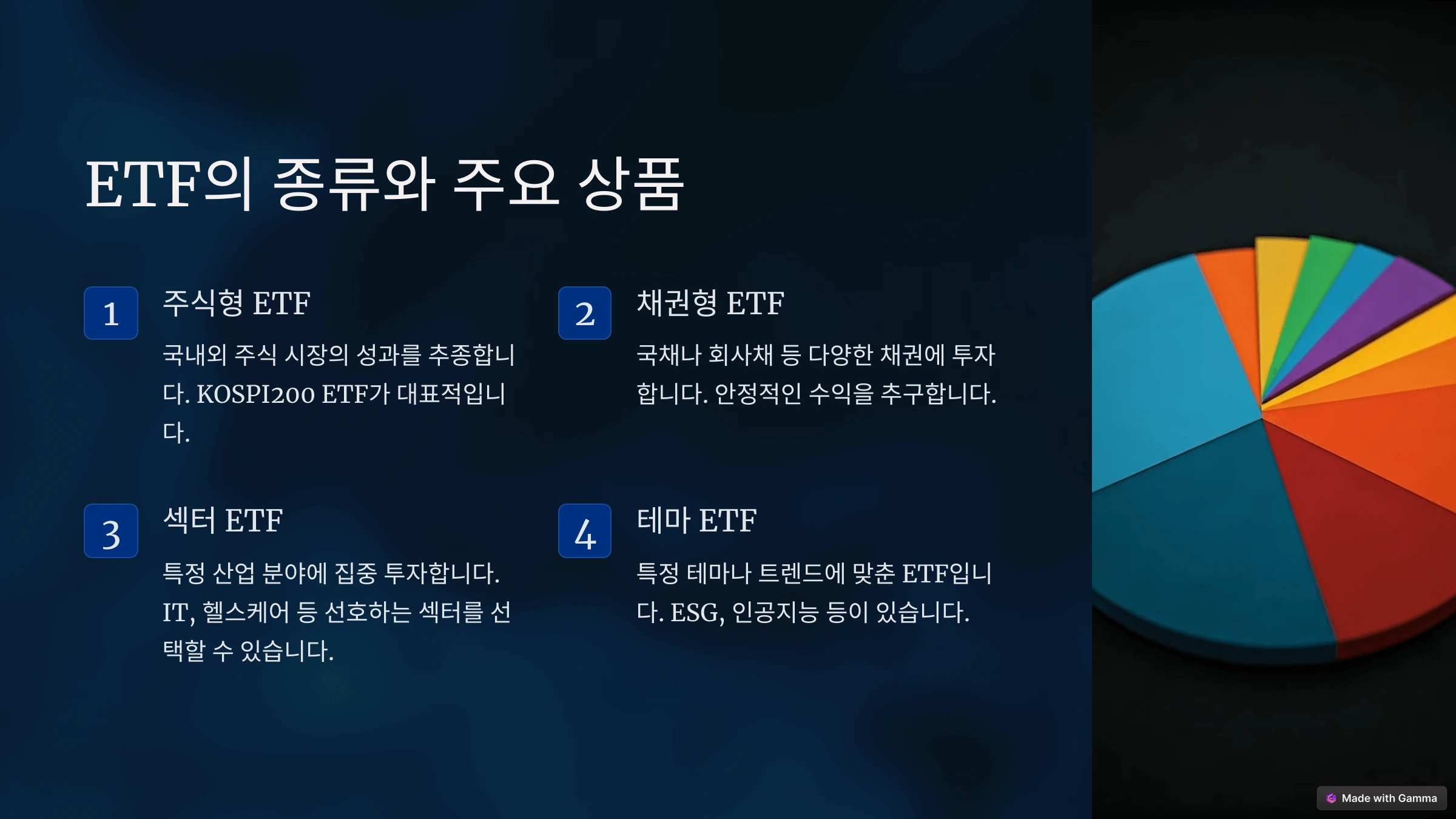 ETF는 투자 자산의 종류에 따라 다양한 형태로 나눌 수 있습니다. 각 ETF는 특정 지수나 테마를 기반으로 설계되며, 투자자의 목적에 맞게 선택할 수 있습니다.