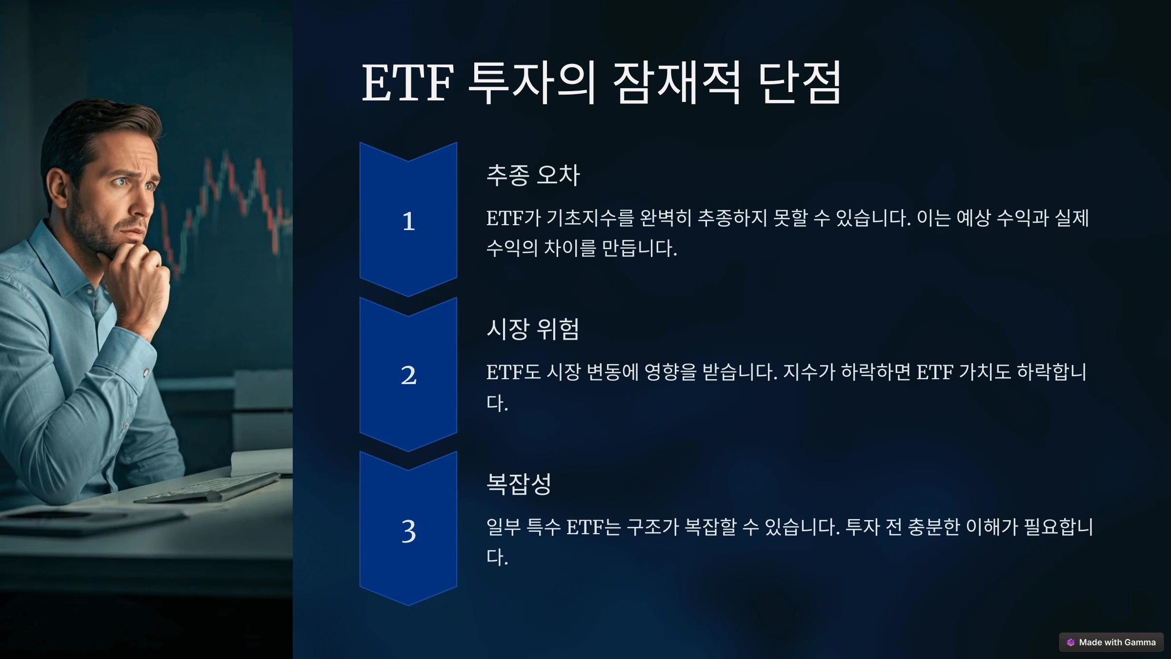 ETF 투자에는 여러 가지 이점이 있지만, 주의해야 할 단점도 존재합니다. 장단점을 잘 파악하고 자신에게 맞는 투자를 선택하는 것이 중요합니다.