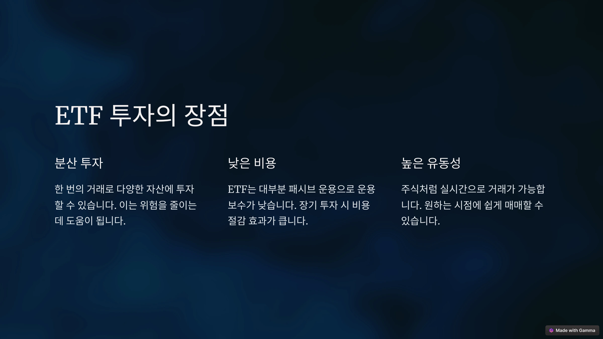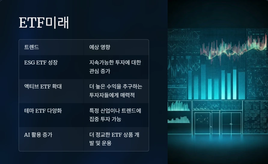- 분산 투자: ETF는 다양한 종목을 포함해 리스크를 분산합니다.