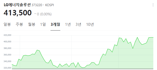 LG에너지솔루션의 주가는 2023년 9월 25일 기준으로 414,000원을 기록하고 있으며, 이는 최근 몇 달간의 상승세를 반영한 수치입니다. 아래는 주요 지표들입니다: